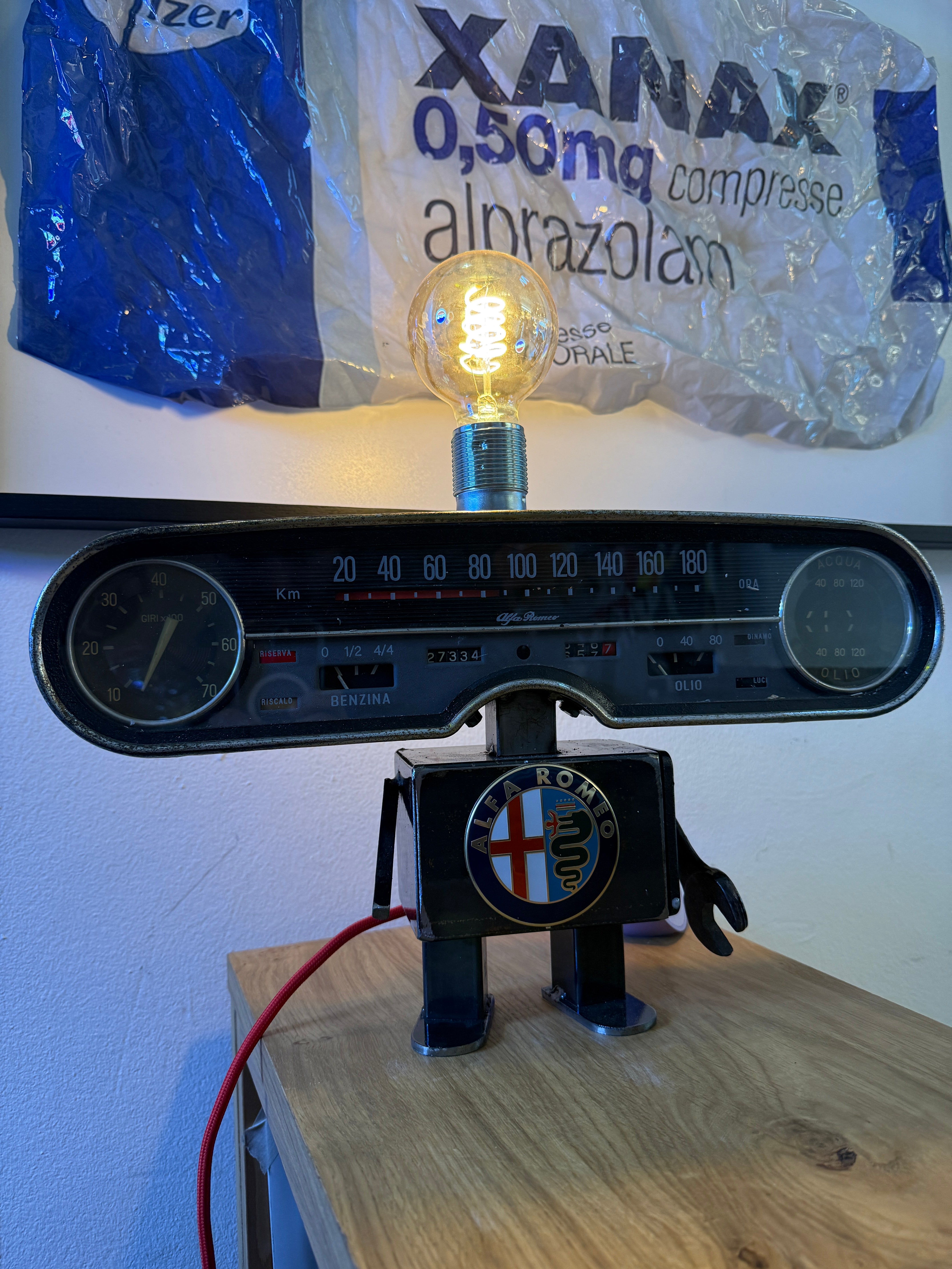 Robot Lamp realizzato con tachimetro originale dell‘Alfa Romeo Giulietta anno 1960 con fregio .